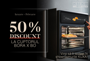 Contractează o bucătărie KUXA studio în perioada 08.01.2026 - 28.02.2026 și vei beneficia de discount de 50% la cuptorul BORA X BO.