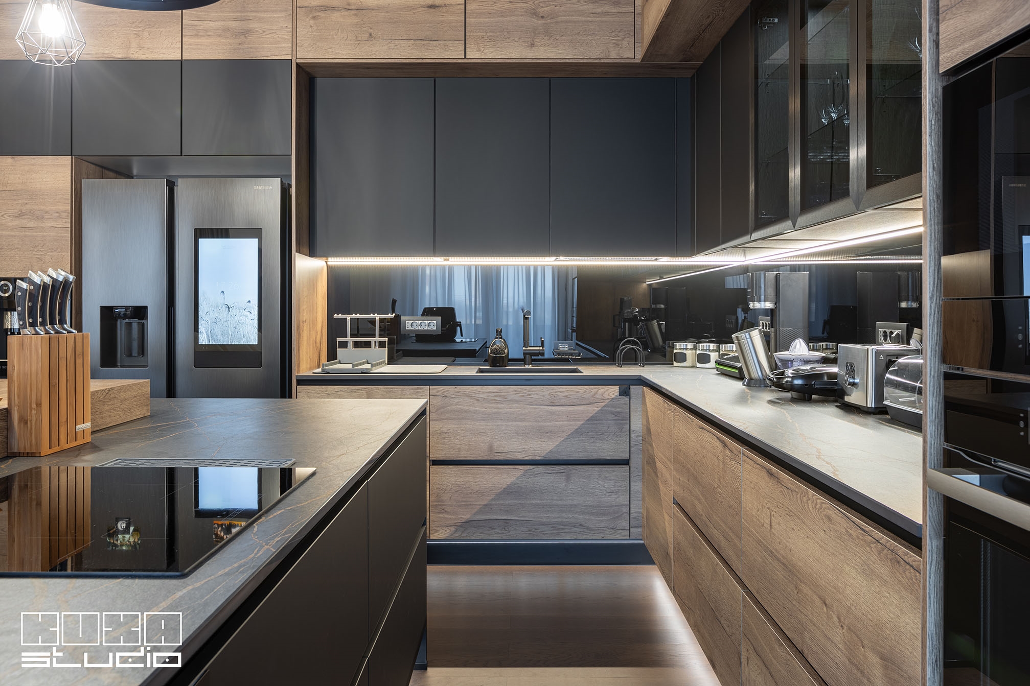 În aceeași locuință se regăsesc două bucătării cu funcționalități distincte, armonizate printr-un concept estetic unitar: o bucătărie principală, destinată preparării meselor zilnice, și o a doua zonă de bucătărie, gândită pentru momentele de relaxare și pentru prepararea băuturilor.