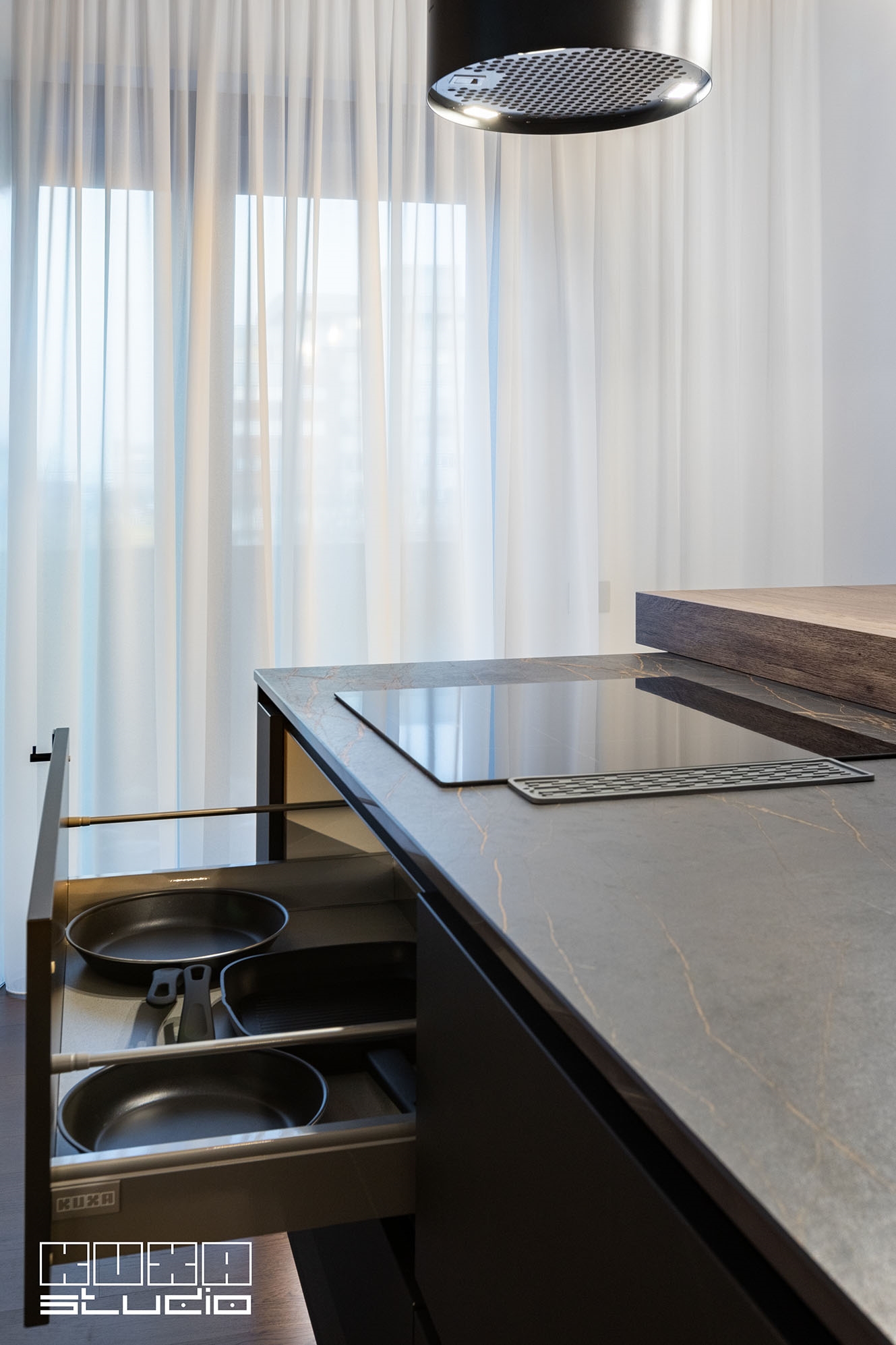 O bucătărie cu un design deosebit, organizată în cel mai mic detaliu, care corespunde perfect, atât estetic, cât și funcțional nevoilor clientului din acest moment.